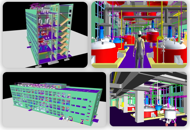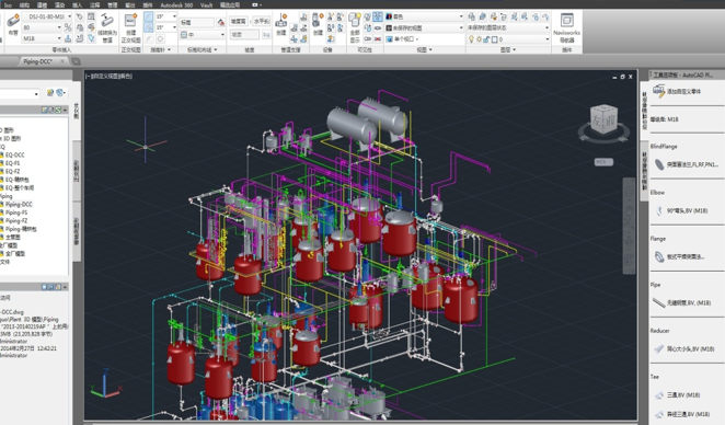 對整個廠房的三維模型進(jìn)行剖切以查看內(nèi)部情況。此圖給出了廠房側(cè)面的一個剖分 視角??梢园l(fā)現(xiàn):建筑結(jié)構(gòu)、設(shè)備尺寸與就位位置、工藝管道和閥門的布局與連接、 暖通系統(tǒng)、消防管道等各個專業(yè)的信息全部綜合在了一個三維模型中。將檢查碰撞的 工作在前期設(shè)計過程中就全部解決,對潛在問題變得可遇見。大幅提高了規(guī)劃設(shè)計的 嚴(yán)謹(jǐn)性和工程施工的科學(xué)性。